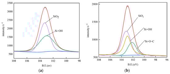 Deconvolution of XPS Si2p high-resolution spectra of quartz sand before and after modification. (a) Unmodified quartz sand; (b) CCQS.
