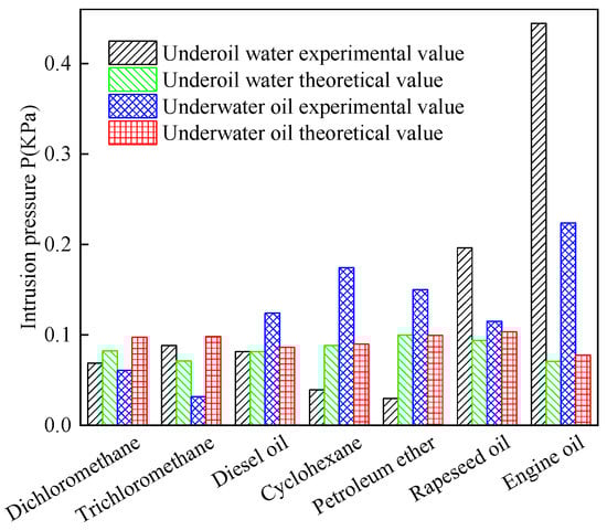 Figure 7 depicts the measured CCQS incursion pressure. A higher incursion pressure meant that the apparatus was more stable. The superhydrophilic and superoleophilic sides, respectively, were the incursion pressures of underoil and underwater. Figure 7 shows that the experimental and theoretical values of the intrusion pressure of seven oil/water mixtures were slightly different. Among them, the theoretical value of the underoil water of engine oil was the smallest, which was only 0.07 kPa, while the experimental intrusion pressure was the largest, reaching 0.44 kPa. The experimental intrusion pressure of the underwater oil of engine oil was the largest, which was 0.22 kPa, while the theoretical intrusion pressure was the smallest, which was only 0.078 kPa. This difference resulted from the engine oil’s very high viscosity and slow flow rate [40].