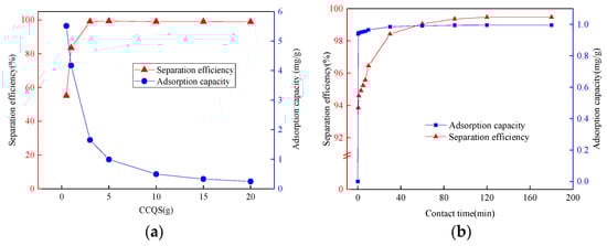 (a) Effect of CCQS dosage on adsorption capacity and separation effectiveness. Initial MG concentration was 200 mg/L and adsorption time was 1 h. (b) Effect of contact time on quartz sand capacity for adsorption. Initial MG concentration was 200 mg/L, and the dosage of CCQS was 5 g. (c) The effect of starting concentration on the rate of MG removal and adsorption capacity. The CCQS dosage was 5 g, and the adsorption time was 1 h.