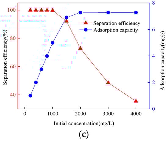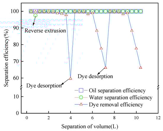 The effect of the synchronous separation of the oil/water mixture and dye adsorption is displayed in Figure 9. The particle size of the CCQS was 0.18~0.42 mm and the initial concentration of MG was 100 mg/L. The removal efficiency of oil in the separation mixture was always above 99.99%. Additionally, when the separation volume increased to 0.8 L, the removal efficiency of water declined from 99.99% to 97.56%. The filtered oil gradually penetrated into the water phase part, resulting in a sudden drop in the water separation efficiency (the prominent point 0.8 L, as shown in Figure 9). Reverse extrusion was used at this point to remove the water phase from the filter media’s pores, and filtering was resumed. The efficiency of water removal was increased to 99%. This was because the height of the water in the middle inlet cavity was too high to reach the invasion pressure, resulting in water penetrating through the filter column and the removal rate of water decreasing. When the filtration volume increased from 3.6 L to 4 L, the dye removal rate decreased from 97.79% to 87.71%, then continued to filter, and the removal rate rapidly declined. This was because, in the early stage, the saturated adsorption capacity of quartz sand was not reached, so it had a high adsorption efficiency. The adsorption sites of quartz sand were constantly reduced when the separation volume increased, resulted in the continuous decline of the dye removal rate.