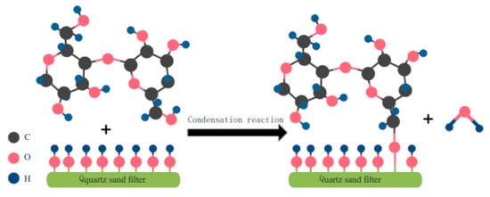The corn cob is composed of cellulose. The general formula of cellulose is (C6H10O5)n [46], which is an extremely regular linear polymer formed by linking glucoside repeating units through β-1, 4-glycosidic bonds. The special morphology and supramolecular structure of cellulose causes its extremely reactive hydrogen bonds to lock in the crystallization zone, making it challenging to interact with reagents and difficult to carry out all kinds of cellulose chemical reactions [47]. Alkali activation was utilized in this investigation to increase the solubility of cellulose by reducing its crystallinity and exposing a significant amount of hydroxyl groups [48,49]. When the activated cellulose was in contact with quartz sand, the -CH2OH group on cellulose reacted with -OH of the quartz sand [24,50], and the hydrophilic group became grafted to the quartz sand, as depicted in Figure 10. The roughness was increased by the addition of waterborne polyurethane, which strengthened the bond between the cellulose and quartz sand.