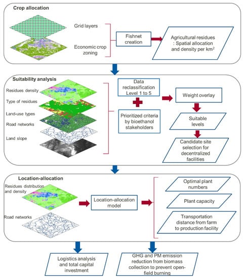 Crop residues derived from post-harvesting process have been problematic due to an on-field incineration, which caused air pollutants and greenhouse gas (GHG) emissions. An appropriate utilization of those biomasses can improve the environmental situation and provide a substitute for fossil fuels. Therefore, this study intends to analyze how left-over agricultural residues should be valorized in the decentralized bioethanol production configuration. With integrated techniques of geographical information system and multi-criteria analysis (GIS-MCA), we identify suitable locations for exhibiting decentralized sites matching the geographical backgrounds in each region. Under the precondition of a complete utilization of the agricultural residues, we found optimal installation numbers 71 units of decentralized production in total through suitability analysis. Conducting the location–allocation model, it is possible to determine production scales from the collectable spatially distributed biomass and transportation distances. Under the presumed conditions of installing 1 to 25 units, the logistics cost and total capital investment can reach USD 1.17–2.46 L−1 and USD 1.17–6.93 L−1, respectively. The results from examining the technical potential and economic feasibility aspects are key to designing decentralized bioethanol production facilities and maximizing the utilization of agricultural residues in Thailand.