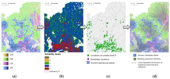 Exemplary mapping results of geographical modelling from GIS-based analyses, beginning with (a) pixeled distribution of agricultural residues, (b) raster layer of suitability levels, (c) areas of suitability level 5 with dissolved candidate points per district, and (d) results of connected lines between refineries and resources.