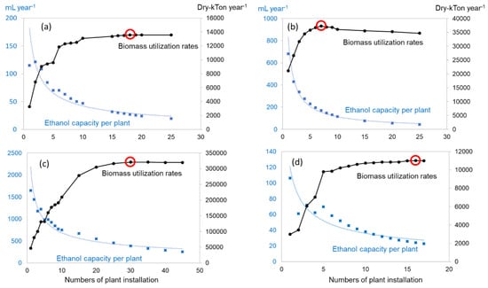 Bioethanol production capacity per plant from changes in facility installation and correlation between the biomass removal rate from collection in the catchment area from different plant installation of different regions: (a) R1_North, (b) R2_South, (c) R3_Northeast, and (d) R4_Central. The circle on the plotted graphs referred to a point where the highest biomass utilization rates can be obtained.