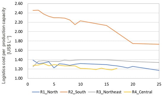 Delivery distances were derived from the location–allocation model. Figure 4 displays the analysis outcomes of the unitary logistics cost per bioethanol productivity associated with installation units. Every regional case study showed a lower logistics cost in line with more numbers of installation. Among four cases, the unitary logistics cost in R2_South was found to be the highest in the range of USD 1.73–2.46 L−1. Nonetheless, R2_South displayed the largest drop in the logistics cost (almost 30%) by increasing facility numbers. The model succeeded in saving logistics costs due to an improvement in searching resources with higher conversion factors, specifically referring to RRs, in addition to PRs in this case. On the other hand, R1_North, R3_Northeast, and R4_Central could benefit from the CR availability, resulting in lower logistics costs. The R4_Central showed the lowest rate in the range of USD 1.18–1.32 L−1, which did not change significantly when increasing the number of facilities.