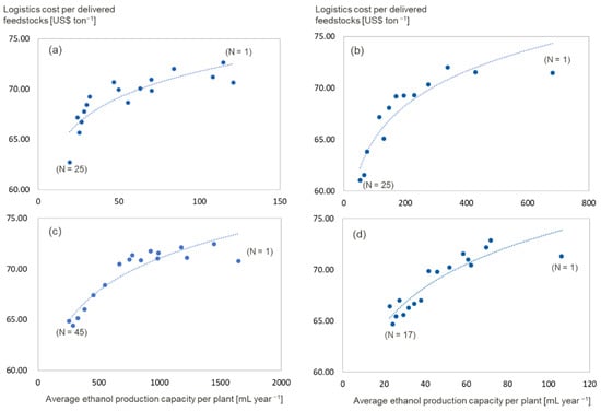 Logistics cost per delivered feedstocks at different average production capacities from four regions: (a) R1_North, (b) R2_South, (c) R3_Northeast, and (d) R4_Central. The numbers (Ns) in brackets represent the number of installed units in each region.