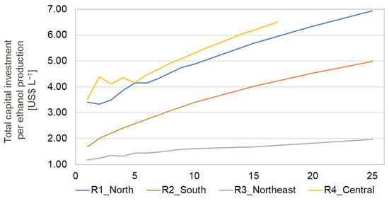 In light of the TCI computation based on production capacity, Figure 6 shows the changing curves of the TCI according to more plant installations. As consistent with every scenario, the TCI was cheaper when there were fewer exhibited production units in the region, which refers to a larger capacity per plant. Therefore, with more numbers of plant installation, the production capacity per unit become smaller, leading to more expensive TCIs. The expectable ranges of the TCI in R1_North were observed to range between USD 3.33 and 6.93 L−1 as the installation plants increased from 1 to 25 plants. For R2_South, the estimated TCI ranged between USD 1.67 and 4.98 L−1. Following that, the price range of the TCI in R3_Northeast within 1–25 plants varied from USD 1.17 to 2.48 L−1, making it the most cost-effective solution due to the large volumes of productivity in this region. Among four regions, R4_Central became the highest TCI curve since it has the lowest bioethanol production potential, ranging from USD 3.51 to 6.50 L−1.
