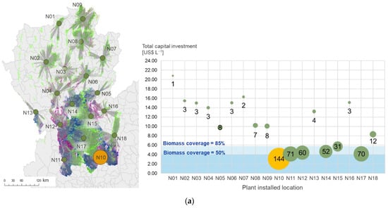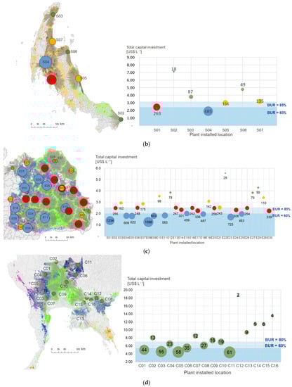 In accordance with the optimal installation numbers based on the maximum biomass utilization rates, the results presented the placement of diverse production scales in one region. The illustration in Figure 7a–d presents geographical mapping of bioethanol scales with the estimation of a capital cost per unit in the respective region. Corresponding to the classified scales, the bubble sizes and categorized colors on the right-hand graphs portrayed the potential scales of the bioethanol refinery. In this study, the proposal construction of bioethanol scales was grouped into four different scales, i.e., ‘small’, ‘medium’, ‘large’, and ‘very large’.