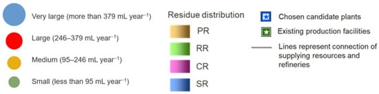 Thus far, the identification of biomass for biorefineries has been mainly focused on a single kind of biomass associated with only some specific locations, or with the purpose of combusting biomass for electric power generation [47,48]. Therefore, comparing to relocating the heterogeneous agricultural post-harvest from the national distribution would essentially become a novelty of the study.