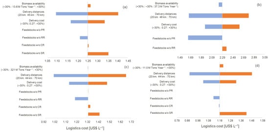 With an attempt to reduce operating costs, there are several potential solutions to minimize logistics costs. One of the important solutions is to lessen the transportation costs associated with delivery distances. Although several distances are recommended under different conditions, road transportation for lignocellulosic biomass is recommended for short distances under 100 km [39]. In the cases without depot hubs, the approximate optimal distance for a biomass collection radius was reported to be within 80 km of the direct collection to the refinery [40].