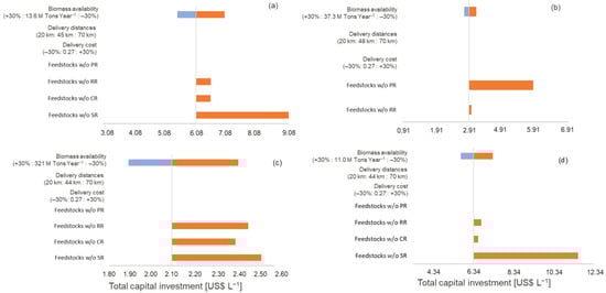 Schematic images of decentralized plants with estimations of total capital investments corresponding to respective production scales in four case studies: (a) R1_North, (b) R2_South, (c) R3_Northeast, and (d) R4_Central. The bubble size represents the production scales, whereas the biomass utilization rates (BURs) are indicated in blue backgrounds.