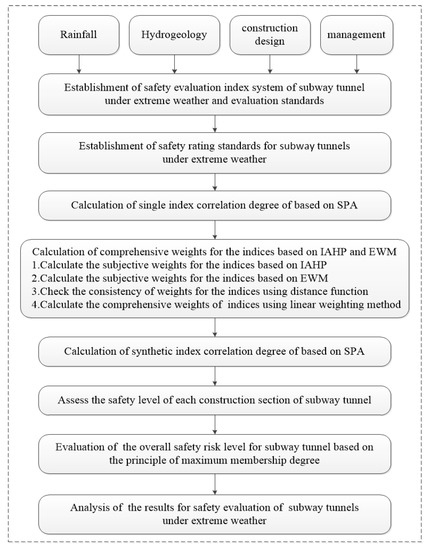 According to the set pair analysis method and the combination weighting method introduced in Section 2.1, Section 2.2, Section 2.3 and Section 2.4, the proposed safety assessment process of subway tunnels under extreme weather conditions is shown in Figure 1.