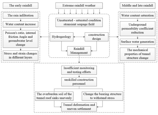 This paper is based on the description of the main risk events that may occur during the construction of urban rail transit projects according to “Risk Assessment Guide for Urban Rail Transit Projects”, “Code of Practice for the Construction Management of Urban Rail Transit Underground Projects” GB50652-2011, and other related codes. The factors affecting the safety of subway tunnels under extreme rainfall weather conditions are divided into accident-inducing rainfall factors, accident-nurturing hydrogeological factors and management factors, and construction design factors to prevent accidents.