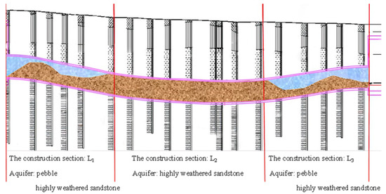 According to the geological exploration report, the water-bearing layers in this area are the pebble layer, strongly weathered sandstone layer, and weathered sandstone layer, among which the pebble layer has high density, a high percolation rate, and high water content, and is the main water-bearing layer in the construction site. Therefore, we divided the interval tunnel into three construction sections, as shown in Figure 3, denoted as L1, L2, and L3, based on the division of water-bearing layers in the foundation soil layer; these are taken as the evaluation objects for the safety evaluation of this interval tunnel.