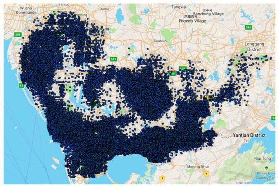 By filtering the location information of events in the order and matching it with geographic information through ArcGIS, the location of shared bicycles can be intuitively analyzed. Figure 2 shows the distribution of shared bicycles order starting events in Shenzhen on 13 April 2021.