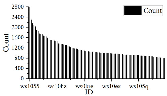 Using the geohash algorithm, Shenzhen is divided into districts with an accuracy of 6 and matched with the GPS coordinates of the start event of the order. Taking the number of start events per hour as the demand for shared bicycles per hour, the distribution of demand in different regions is obtained. As shown in Figure 3, the travel demand of the top 100 communities in Shenzhen at 8:00 on 13 April 2021 is shown, where the abscissa is the communityID, and the ordinate is the bicycle-sharing demand, most of which is in the residential areas and transportation hub areas and a small number of commercial areas.