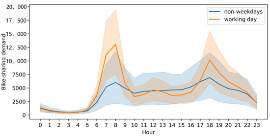By using the Seaborn database and combining the time and calendar information of cycling starting events, we can obtain the correlation between the daily demand for shared bicycles and whether it is a working day, as shown in Figure 4, where the abscissa is 24 h per day, and the ordinate is the demand for bicycle sharing. We found that the distribution of daily bicycle-sharing demand is saddle shaped. The demand at daytime is higher than that at night time. The time distribution is more uneven on weekdays. The distribution of bicycle-sharing demand on non-weekdays is relatively uniform, without significant heterogeneity.