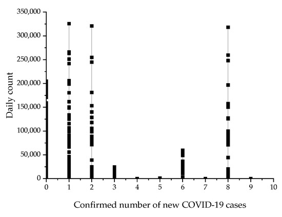We analyzed the correlation between the daily increase in COVID-19 patients and the historical data of bicycle-sharing orders obtained by the center for Disease Control and prevention of Shenzhen City, as shown in Figure 5, where the abscissa is the daily confirmed number of new COVID-19 cases, and the ordinate is the bicycle-sharing demand. The situation where the demand is 0 is due to the bicycle-sharing data corresponding to the new COVID-19 cases not being counted. The results showed that when there was an epidemic, the demand for shared bicycles sharply increased compared with that when there was no epidemic, and it reached a peak when the number of new patients per day was eight–nine. However, due to the strict control measures in Shenzhen, we cannot conduct a correlation analysis of when the number of new patients was more than 10 per day.