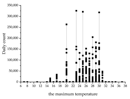 In addition, we also analyzed the correlation between the 441-day weather record data in Shenzhen obtained by the Shenzhen Meteorological Bureau and the shared bicycles historical order data, as shown in Figure 6. The abscissa is the maximum temperature of the day, and the ordinate is the bicycle-sharing demand of the day. The situation where the demand is 0 is due to the bicycle-sharing data corresponding to the temperature not being counted. The daily maximum temperature in Shenzhen ranges from 7 °C to 37 °C. Through statistical analysis, we found that the demand is small when the maximum temperature is lower than 19 °C and higher than 31 °C; when the daily maximum temperature is 20~30 °C, the average daily demand for bicycle sharing is large; and when the daily maximum temperature is 23 °C, the demand reaches a peak.