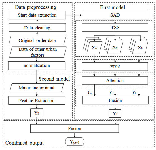 Figure 7 shows the overall structure of the USTARN model. The model includes four parts: the data processing part, the first prediction model, the second prediction model and the final prediction. The data processing part is to extract the starting event from the historical data of bicycle sharing and normalize other urban information. The first prediction model is the spatiotemporal attention residual network, including the spatial division module (SAD), time series division module (TSS), filled residual network (FRN) combined with the attention mechanism (Attention) and the fusion prediction (Fusion). The second prediction model is the prediction of other urban factors, and the final prediction is the combined output.
