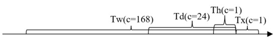 Time series segmentation (TSS). The essence of traffic data is periodic time series data [28]. According to the relevant literature in the spatiotemporal field [29], a small number of critical data can determine a small number of future data. Therefore, combined with the asynchronous long-term characteristics, the comprehensive prediction of future demand can improve the prediction accuracy of the model. We use three segments with different timestamp lengths to predict the bicycle-sharing demand in the next hour. We define Tx = 1 for the segment to be tested, c = 1 for the segment Yh adjacent to 1 h, c = 24 for the segment Yd adjacent to 1 day and c = 168 for the segment Yw adjacent to 1 week. As shown in Figure 9, the model cuts the input data into the above three segments according to the time series.