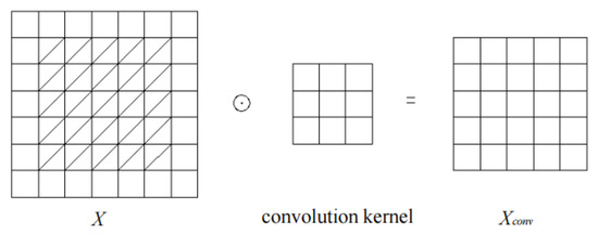 Convolution unit (Conv). Due to the large urban area, the number of cells after SD is also large, and the distance interval between any two cells is also large. Although the interaction between regions near each other is the main influence, the interaction between regions far away from each other cannot be ignored. Convolution operation is a very good method to capture the spatial dependence of two points [34]. As shown in Figure 9, we first use convolution kernel parameters of size 1 × 1 check data for dimensionality reduction to reduce the influence of noise points, then use convolution kernel parameters of size 3 × 3 to extract data features and finally use convolution kernel parameters of size 1 × 1 to restore data dimensions. In addition, we ensure the integrity of data transmission through the edge filling. As shown in Figure 11, the input information is filled with a circle of blank information. is the Hadamard product multiplied between block elements. Xconv is the output of convolution.