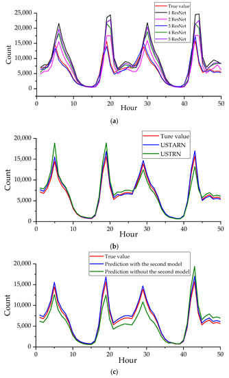 It can be seen from Table 2 that USTARN with a three-layer residual network achieved the best performance. Figure 13 shows the fitting curve between the predicted value and the real value of the bicycle-sharing demand in region 118 of the three experiments on 13 and 14 April 2021. It can be seen from Figure 13a that the prediction accuracy of the network in experiment A initially increased with the increase in the depth of the model, but when it exceeded four layers, the predicted accuracy of the network began to decline, and finally, the performance of the three-layer residual network was the best. This may be because the training difficulty increases when the depth is too deep, which affects the overall accuracy of the model. It is concluded from experiment A that USTARN has the highest accuracy when choosing a three-layer residual network.