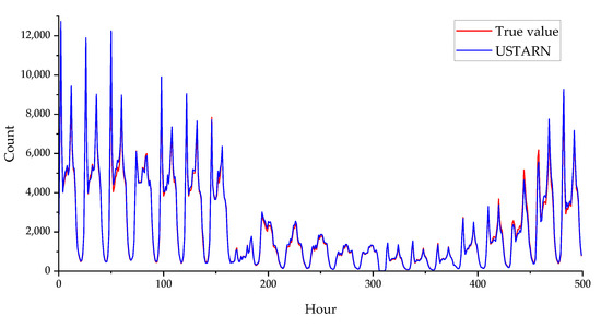 To sum up, the best structure of the USTARN model is to include the second prediction model and use the three-layer residual network combined with the attention mechanism. Figure 14 shows the complete test set fitting curve of USTARN. The abscissa is the hour, and the ordinate is the bicycle-sharing demand in the region. The orange broken line is the predicted value of a region, and the blue solid line is the real value of a region. Through the comparison, we can see that the line trend is basically the same, the coincidence degree is high, and the prediction accuracy of the model is high.