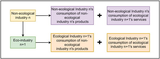 In separating the intermediate output of the ecological industry, the output of the non-ecological industry is divided into two parts. One is the consumption of non-ecological industry products by the non-ecological industry, and the other is the consumption of services of the non-ecological industry to the ecological industry, as shown in Figure 3. As mentioned above, the total intermediate output of the ecological industry is 789,932,000 yuan. The distribution of intermediate output refers to the intermediate input distribution coefficient of the ecological protection industry in the input–output table of 149 sectors in China in 2017. Moreover, ecological-service consumption of certain industries is revised according to the matching of ecological service type and industry, with reference to the research results of Zhang [], Xie et al. [], and Zhao et al. [].