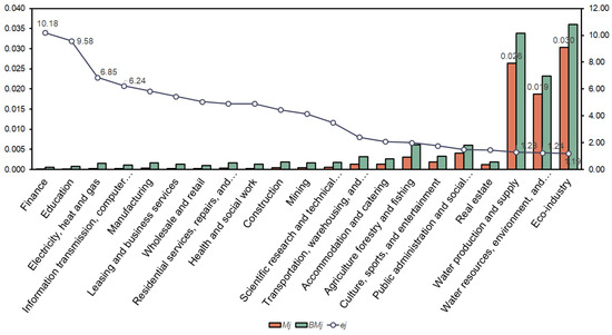 The results show that the direct-consumption coefficient (Mj) of the eco-industry varies by industrial sector (Figure 5). The public administration and social organization industry, water resources, environment, and public facilities management industry, eco-industry, and water production and supply industry all have a high share of inputs of ecological services. All other industrial sectors have relatively low inputs of ecological services, indicating a strong tendency for direct consumption by the eco-industry. The eco-industry has the largest direct-consumption coefficient for eco-industry (0.030) and the second-largest coefficient for the water production and supply industry (0.026), followed by the water resources, environment, and public facilities management industry (0.019). In addition, at 0.31% of the total input value for ecological services, the primary industry ranked fifth. In contrast, the finance, education, electricity, and gas industries have less direct ecological services inputs. The complete-consumption coefficient (BMj) trend of the eco-industry is similar to that of Mj. Industrial sectors with higher complete-consumption coefficients for eco-industry are the same as those with higher direct-consumption coefficients (Figure 5). Industrial sectors with lower complete-consumption coefficients for the eco-industry originate from the finance, education, electricity, gas, and information transmission, computer services, and software industries. In this paper, the consumption multiplier (ej) of the eco-industry is obtained by comparing the direct and complete-consumption coefficients of the eco-industry. The consumption multiplier of the eco-industry exceeds 1 for all industrial sectors, especially for finance (10.18), education (9.58), electricity, heat, and gas (6.85), and information transmission, computer services, and software (6.24). While these industries consume only a small share of ecological services directly, their indirect consumption is high. The consumption multipliers of the eco-industry in the water resources, environment, and public facilities management industry (1.24), eco-industry (1.19), and water production and supply industry (1.28) are small.