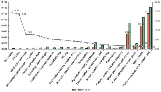 In this paper, the capacity of each industrial sector to create added value is calculated through the consumption of eco-services according to Equations (8)–(10) (Figure 6). While the consumption value-added coefficient () of the eco-industry varies considerably across industries, top-ranking industrial sectors are more relevant to the ecological environment. The water resources, environment, and public facilities management industry has the highest value (0.121), followed by the eco-industry (0.079) and the water production and supply industry (0.052). Certain tertiary industries such as education, finance, wholesale, and retail trade have lower value-added coefficients for direct consumption of ecological services. In addition, the complete-consumption value-added coefficient of the eco-industry () for each industrial sector is more significant than its direct-consumption value-added coefficient. This relationship indicates that part of the added value of these industrial sectors originates from using ecological services of the eco-industry for intermediate use. The consumption value-added multiplier (pj) of the eco-industry shows that the eco-industry directly drives the added value of both the eco-industry (1.36) and the water resources, environment, and public facilities management industry (1.17). In contrast, the development of the eco-industry has a more vital ability to indirectly contribute to added value in sectors such as education (19.37), finance (18.64), and wholesale and retail trade (7.84).