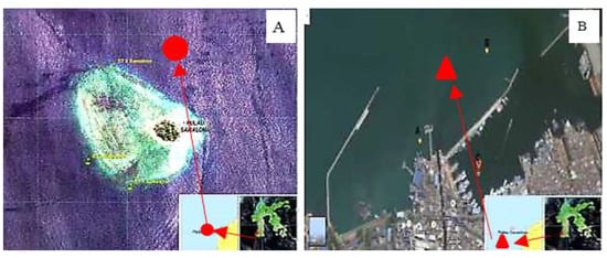Sampling locations of sea sponges and seawater sources of bacterial isolates. The distance between the two sampling points is ±3.45 km; (A) map of Kodingareng Keke Island, part of the Spermonde Archipelago Cluster, Makassar City Administration. The sampling location of the marine sponge Auletta sp., the source of Bl. Sponge sampling point (red circle) at coordinates 5°06′38.12′76″ S; 119°17′7.76′44″ E; (B) sampling location of marine water source of bacteria type Sb (red triangle), obtained around Soekarno-Hatta Seaport, Makassar. The seawater sampling point is at coordinates 5°06′25.23′14″ S; 119°25′3,21.25″ E.