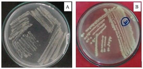 Comparison of morphology of two types of bacterial isolates cultured on NA selective media, after incubation 1 × 24 h; (A) growth of type Bl bacterial isolates; (B) growth of Sb type bacterial isolates.