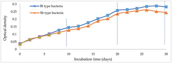 Based on the optical density (Figure 3), it was shown that Bl bacteria had a higher optical density than Sb bacteria. This situation indicates that the population and cell size of Bl bacteria is large, and growth is more aggressive than that of Sb bacteria. Changes in OD600, based on the incubation period, indicated the activity of both bacterial cell types (Bl and Sb). Figure 3 shows that the growth rate of Bl bacteria is relatively higher than that of Sb [4,6,19]. Thus, it can be predicted that the level and strength of degradation of Bl bacteria is dominant compared to Sb bacteria. In the incubation period, for the first 10 days, both bacteria appeared in the adaptation phase. The next 10 days, or an incubation period of 20 days, showed the bacteria in the cell division or multiplication phase. The incubation period of 30 days showed that bacterial cells have decreased activity [4,14].