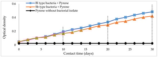 A comparison of the optical density (OD) values of the two types of bacteria during the interaction with pyrene can be assumed to embody the biodegradation power of Bl and Sb bacteria against pyrene (Figure 4). It appears that the OD of Bl bacteria is higher than that of Sb bacteria. The difference in OD values begins to be seen at the 6-day interaction period, where the OD shown in the interaction of bacteria (Bl + pyrene) is higher than the OD value of the interaction of bacteria (Sb + pyrene). This situation continues until the interaction reaches 30 days; even the difference in OD values tends to get wider with the increase in interaction time. This indicator shows that the biodegradation activity of Bl bacteria against pyrene is more potent than that of Sb bacteria. In general, it can be said that both types of test bacteria have degradation activity against pyrene [30,73].