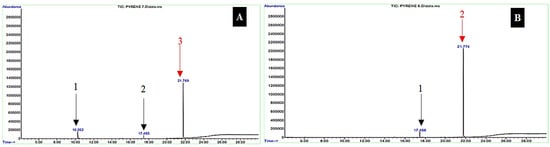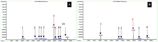 However, the peak height indicated that the pyrene component decreased more sharply than in during the first 10 days of interaction. On the other hand, the components suspected of being biodegradation products experienced a slight increase in peak height, indicating an increase in the components of degradation products [38,94]. Chromatograms for the 30-day interaction between Bl and Sb bacteria with pyrene (Figure 7A,B) exhibited significant changes, especially in the number of new peaks formed, indicating that the peak height of the pyrene component experienced a sharp decrease. Ten peaks were identified in the chromatogram of the interaction of Bl bacteria with pyrene (Figure 7A), indicating that there were nine components of the bacterial biodegradation product type Bl.