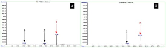 Based on a comparison of GC/MS chromatograms at 10-day contact of biodegradation of pyrene components, there were three peaks (Figure 5A) resulting from the interaction of Bl bacteria with pyrene, and there were two peaks (Figure 5B) in the interactions between Sb bacteria and pyrene, indicating that B1 bacteria more potently reduced aggressiveness of pyrene compared to Sb bacteria [94,95]. The GC/MS chromatogram at the 20-day interaction period between Bl and Sb bacteria against pyrene (Figure 6A,B) showed a relatively similar appearance to that of the 10-day interaction, especially the number of peaks [4,90,92].