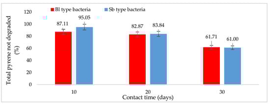 Comparison of the percentage of pyrene components as a substrate not degraded by Bl and Sb bacteria based on interaction time.