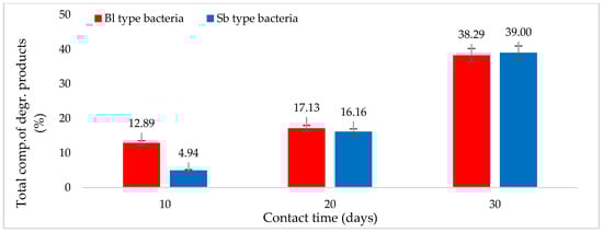 Aspects of the percentage analysis of the total components of the biodegradation product as a result of the work of the two types of bacteria tested against pyrene (Figure 9) showed a similarity in the path of biodegradation strength [7,14]. The percentage of total biodegradation products of Bl test bacteria in the first 10 days of contact phase was greater than that of Sb’s total biodegradation products. However, in the second 10 days of contact, the percentage of total biodegradation products between the two test bacteria showed similar results. Even at the third phase of contact, the 30th day of the interaction period, the percentage of total biodegradation products of Sb type bacteria was more significant than that of Bl type bacteria [5,11,94,95].