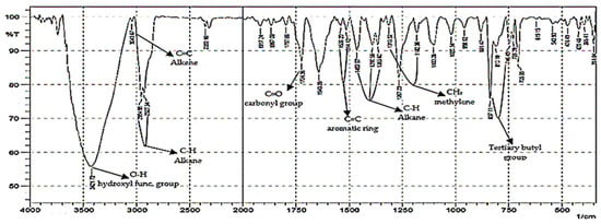 The absorption area is 1500–1600 cm−1 and shows the typical shape of the aromatic C=C bond. The peak of the absorption indicates the presence of aromatic cyclic bonds. The absorption area is 1050–1300 cm−1, indicating the presence of the C–O functional group, precisely at the peaks of 1093.64 cm−1; 1192.01 cm−1; and 1261.45 cm−1, suggesting the absorption of compounds that have a –OH (hydroxyl) functional group, each indicating a compound of alcohol, ether, carboxylic acid, and ester groups. Aromatic rings with C–H bonds appear at absorption in the range of 690 to 900 cm−1, while at peaks of 40.67 and 794.67 cm−1, they indicate the presence of aromatic cyclic bonds [4,21,98,99]. These results indicate the suitability of the components of simple organic compound biodegradation products of type B1 bacteria against pyrene (Table 1).