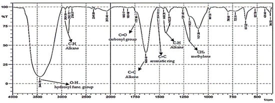 The results of FTIR analysis (Figure 10) showed one of the degradation products of simple organic compounds in the form of phenol, alcohol monomers, hydrogen-bonded alcohol, a carboxylic acid group, carboxylic acid hydrogen bonds, or aromatic carbon-hydrogen bonds. Absorption in the range 3200–3600 cm−1, specifically 3444.87 cm−1, indicates the presence of the -OH functional group. The absorption at 2958.80 and 2929.87 cm−1 showed a peak with a characteristic shape of the absorption region of C–H alkanes. The absorption area of 1610–1680 cm−1, precisely at the peak of 1639.49 cm−1, shows a typical shape representing C=C alkenes [95,99].