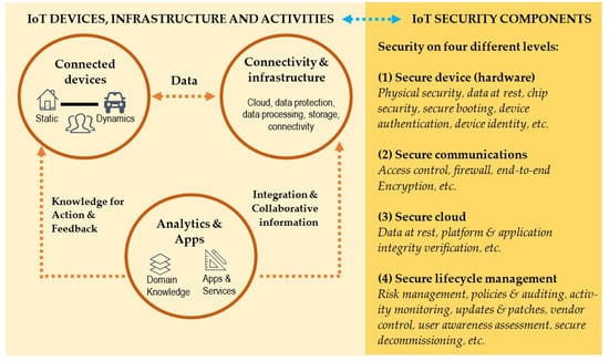 Figure 1 illustrates an application scenario for IoT data secured ecosystem. In general, there are three building blocks that construct the basic applications (and functions) of IoT. These include: (a) connected devices—both static devices (e.g., house appliances) and dynamic devices (e.g., vehicles); (b) connectivity platforms and infrastructure (e.g., cloud, data protection, data processing, storage, and connectivity); and (c) analytics and apps (e.g., domain knowledge generate from the used of IoT, and apps and services). The outputs from the interactive used of these three blocks can be in a form of data, integration and collaborative information, and knowledge for action and feedback. Together with the devices, infrastructure, and analytics, these outputs need to be securely protected. The security protection can be introduced and applied on four levels, namely, the devices (hardware), channels and methods of communication, cloud and storage platform, and lifecycle management which associated with the perspectives of risk management, policies and auditing, awareness assessment, etc.