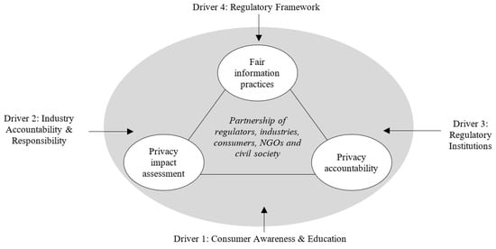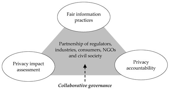 Drawing upon the principles of collaborative governance and EU GDPR, Figure 2 presents the conceptual framework for this paper. The framework shows how the three essential components of data protection—which are (i) fair information practices, (ii) privacy impact assessment, and (iii) privacy accountability—may be harnessed through a partnership of regulators, industry, consumers, and civil society towards collaborative governance for IoT data protection. This model highlights the larger effect collaborative governance will have on the overall ecosystem encompassing the main stakeholders.