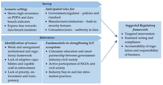 It is based on the viewpoint that the convergence of IoT and other Industry 4.0 technologies toward the Sustainable Development Goals (SDGs) platform is possible, but this demands supportive innovation and policies [16] and, in the case study of Malaysia, this mixed methods paper aims to determine the issues of IoT consumer data governance and propose measures to strengthen consumer data protection. Ultimately, this paper attempts to address the following two questions: (a) “What are the emerging scenarios of IoT consumer data security issues?” and (b) “What institutional changes and strategies are required to achieve a better framework for IoT data governance?” The main contribution of this paper is twofold. First, it determines a multi-stakeholder model for the governance of IoT consumer data in response to data security issues we observed, highlighting the crucial need of collaborative governance framework for IoT data protection. Second, based on the model established, this paper suggests the mitigating approaches in addressing IoT related data security issues. Echoing this, the multi-stakeholder approach for climate change governance specifically the system for information sharing [17] allows for a collaborative and inclusive governance of emerging issues. Recognising the economic, social, and environmental potential benefits of IoT whilst addressing emerging issues may lead to better adoption and usage of this technology.