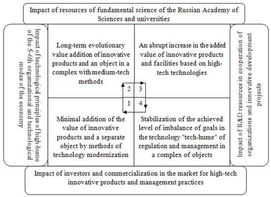 It was revealed that the resulting property of economy depends on the degree of formalization of the organizational behavior of the elements of the system [4,36,37]. In the short term of development, at stages 1 and 2 of the innovation cycle, this is ensured by directive management with a strong formalization of structures. However, at the same time, the innovative activity of the personnel and their susceptibility to high-tech environmental factors are low. This determined the development of factor parameters for the quality of additional KFUs and the expansion of the roles of personnel with self-organization capabilities.
