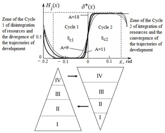 The thickness of the lines in the figure increases with the increase in the number of nestings of approximating functions, interpreting the increase in the integration of resources and efficiency Hi in terms of innovation factors x. At A = 18, the approximation corresponds to the approximation of the Dirac function (vertical line in Figure 2).
