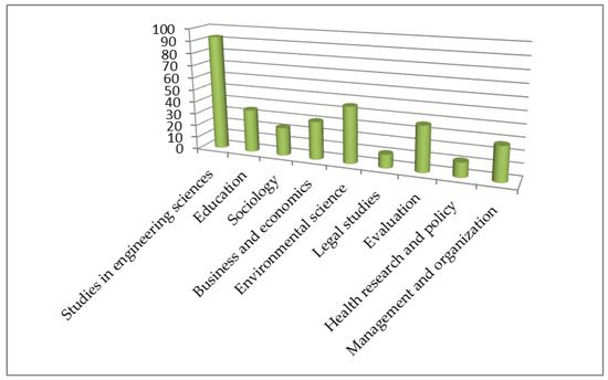 In relation to the study area, from approximately 300 papers, books, database articles, universal sustainable principles and legislative documents, the following were used: studies in engineering sciences (93); in education (35); in sociology (17); in business and economics (35); in environmental science (46); in legal studies (11); in evaluation (37); in health research and policy (12); and in management and organization (28), plus some applications in other fields (Figure 3) [18].
