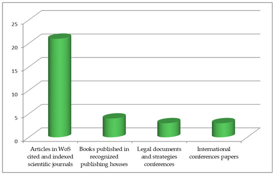 Finally, the data show that the most representative works [19,20] that helped to carry out this study were articles in WoS-cited and indexed scientific journals (21); books published in recognized publishing houses (4); legal documents and strategies (3); and international conferences papers (3) (Figure 4).