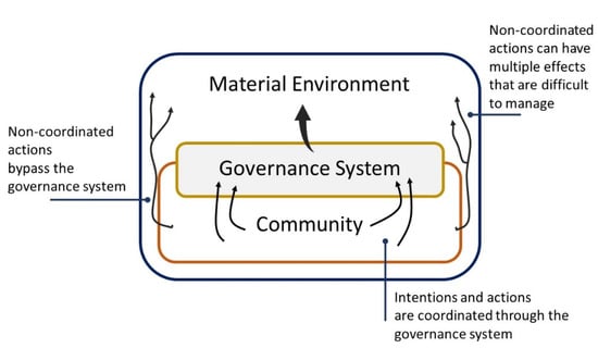 This also means that governance systems are shaped by their material environments in ways that are only partially observed and understood from within the system (Figure 5). Duineveld et al. speak of “material events”, events and processes in the environment that can affect communities slowly or quickly, vaguely, or dramatically; observed and unobserved; and which can affect the governance systems in those communities through similarly diversified pathways [115]. Material events can slowly affect a community, then its livelihoods, and then dramatically its governance system (an uprising, a revolution). Or, they can shock the governance system, as things cannot be coordinated anymore (an obliterating volcanic eruption) [116].