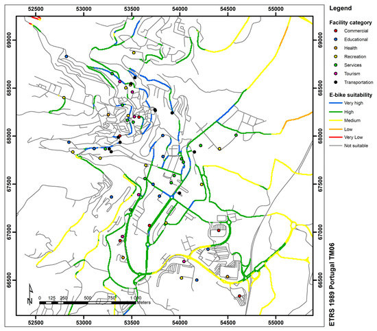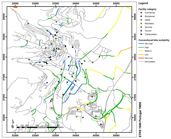 At the same time, the local academic community undertook several studies on the feasibility and implementation conditions to promote soft mobility in general, with particular emphasis on hillside cities. The criteria and suitability maps for Covilhã’s urban perimeter obtained with the spatial multi-criteria cycling suitability analysis for conventional and electric bikes, according to the method described in Section 2, are presented in Figure 3, Figure 4 and Figure 5. The study covered the entire road network of the urban perimeter parishes (430 km) and not just the urban center of Covilhã (intervention area considered by the City Council).
